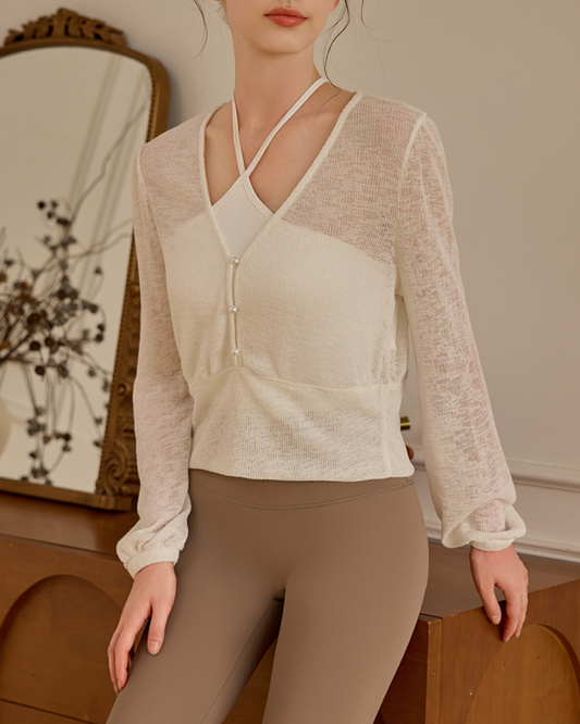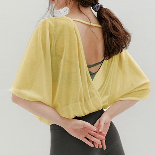 Vネックのワッフル生地ゆったりヨガトップ 2284