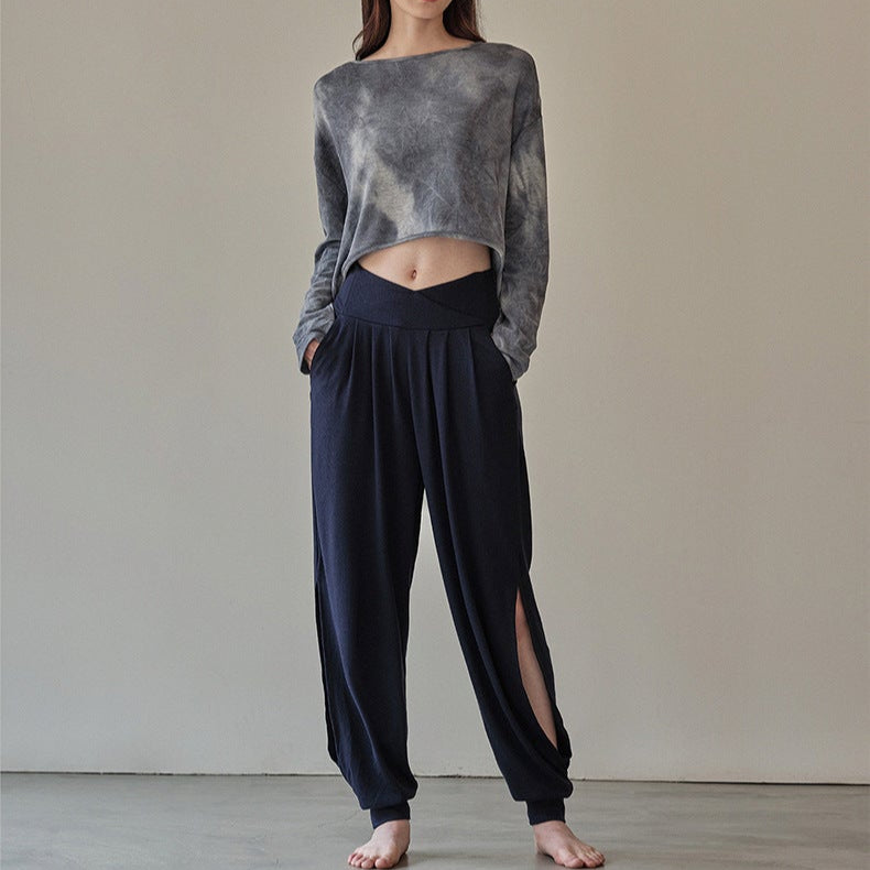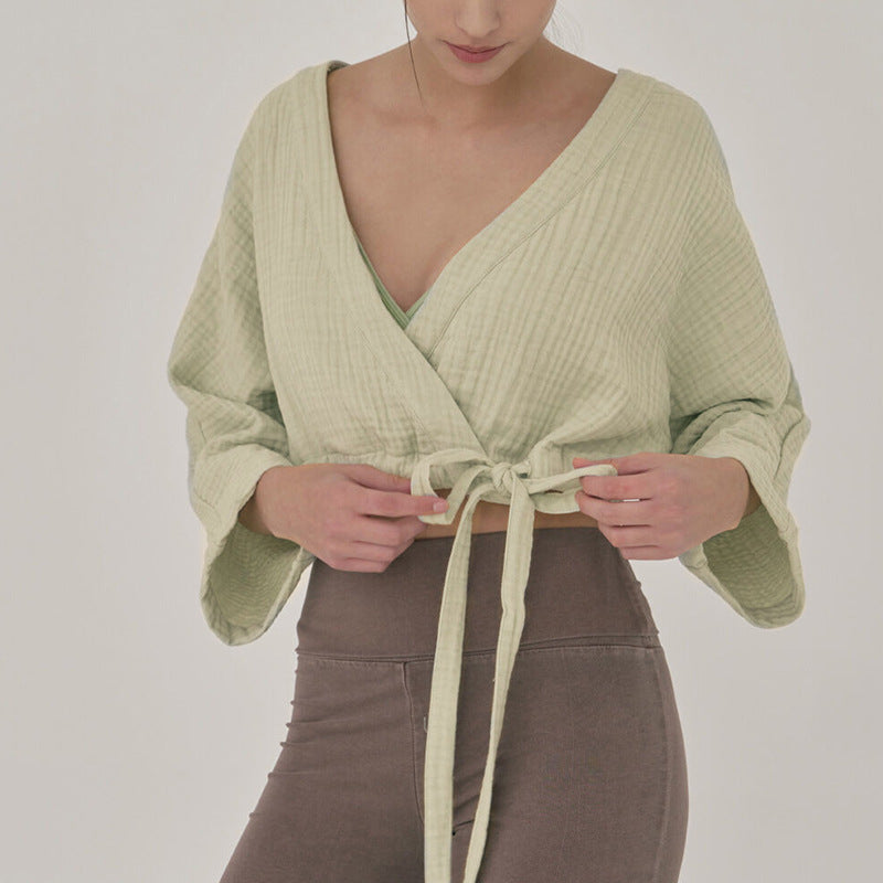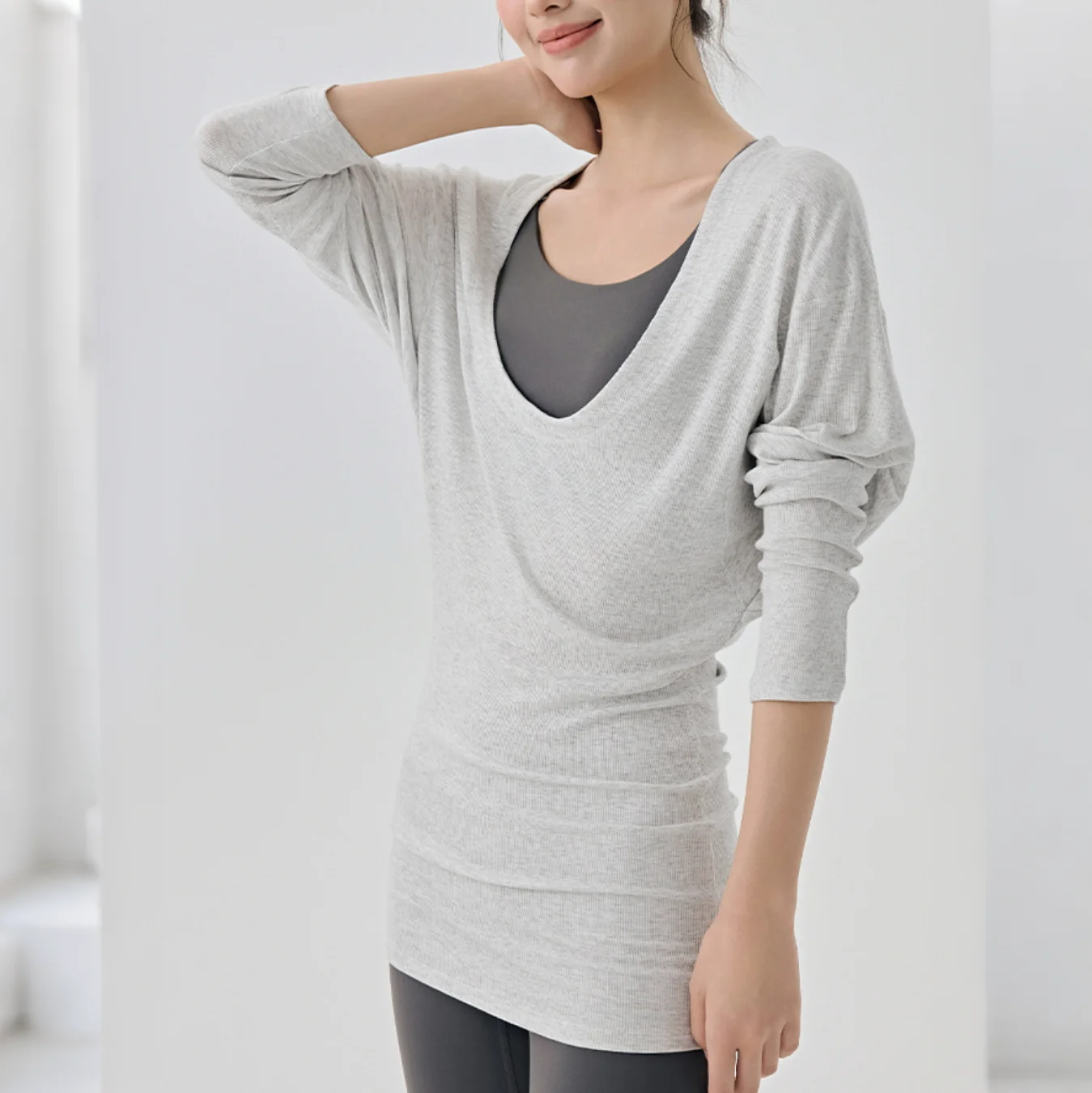 Vネックのワッフル生地ゆったりヨガトップ 2284