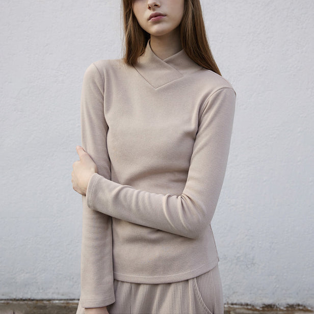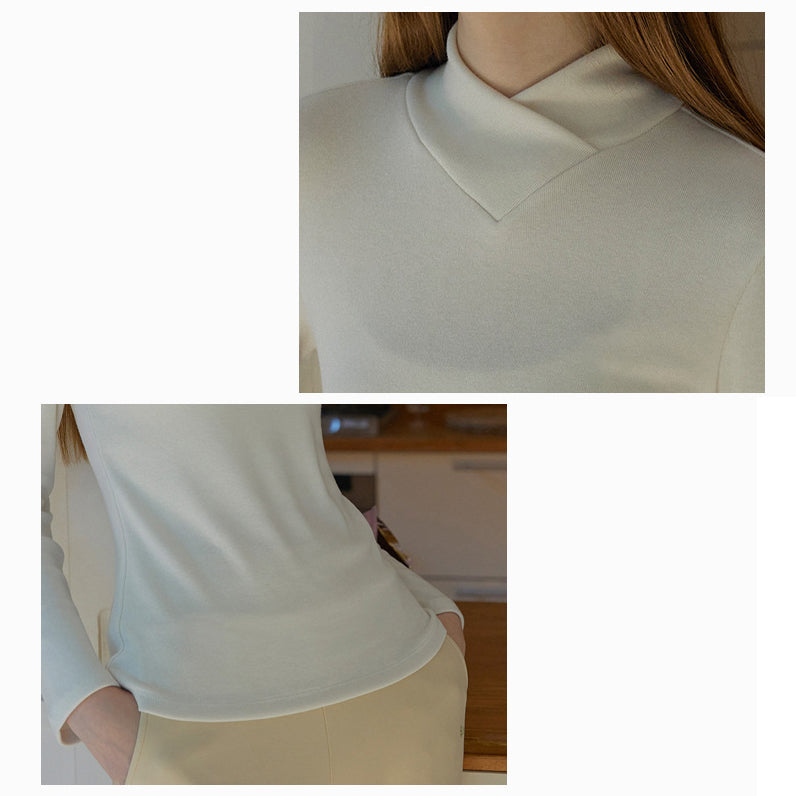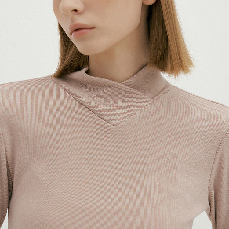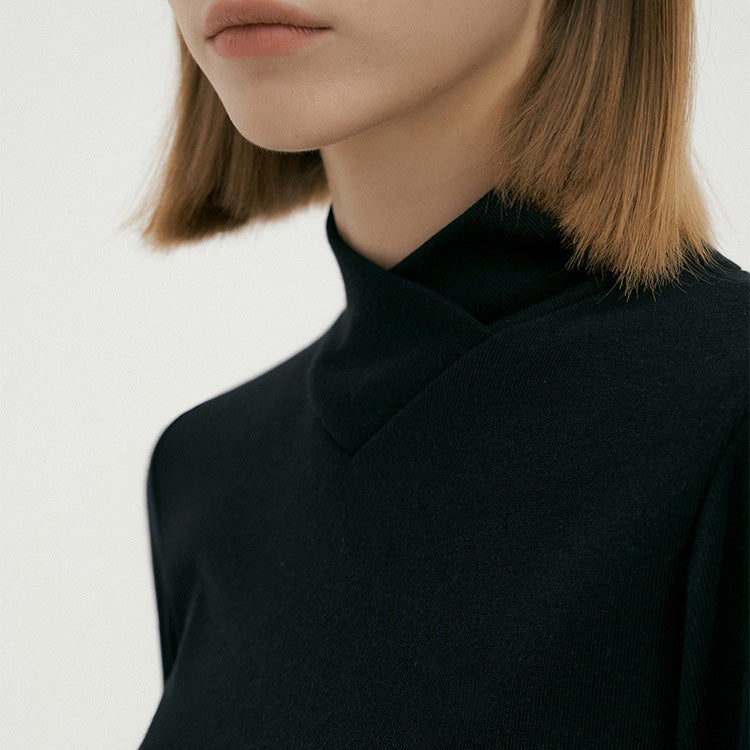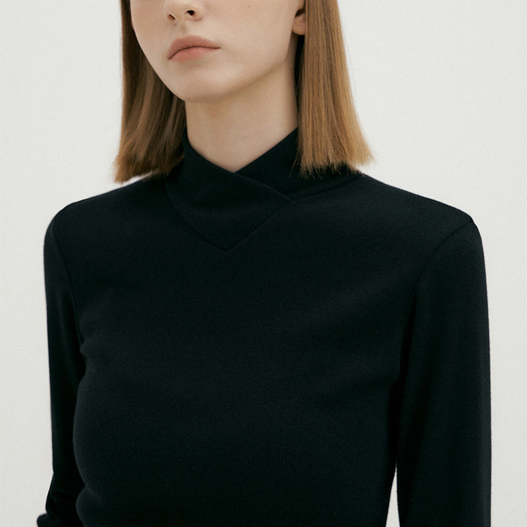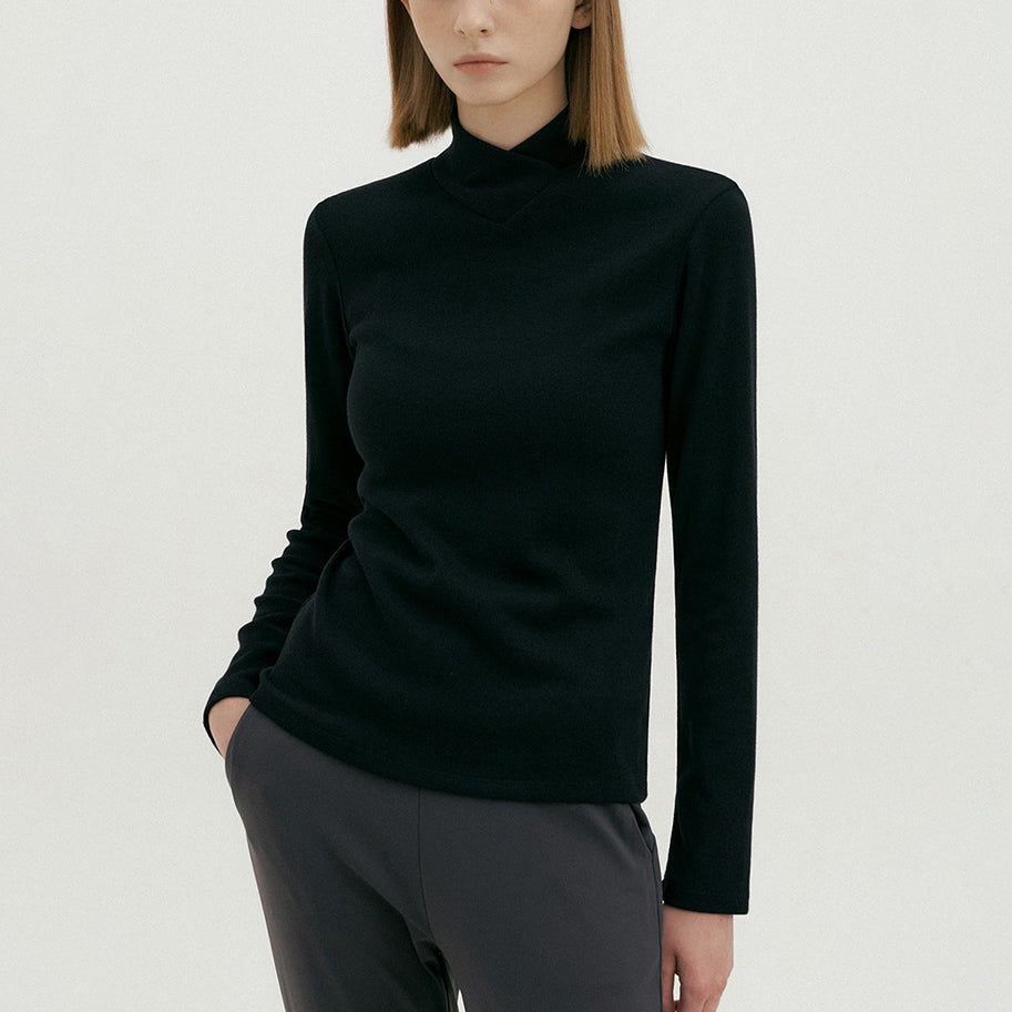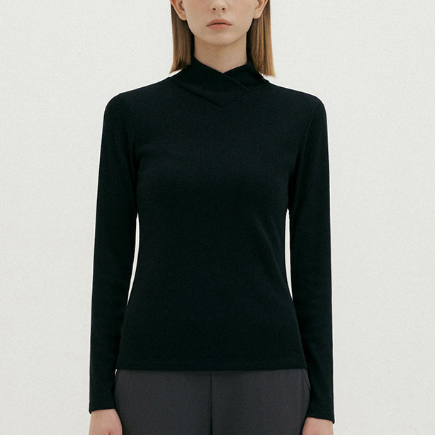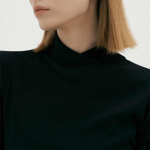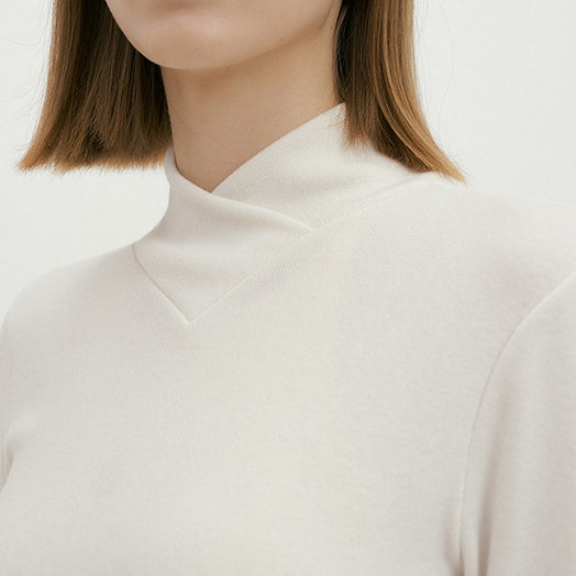 包み込まれるようなとろみがあり、肌あたりのソフトなシンプルハイネッククロスロングスリーブTシャツ。