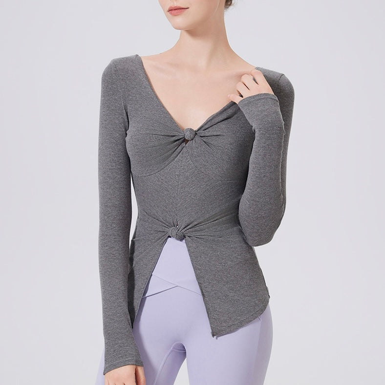 Vネックのワッフル生地ゆったりヨガトップ 2284