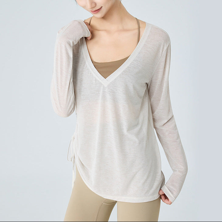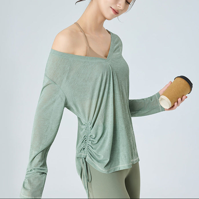 Vネックのワッフル生地ゆったりヨガトップ 2284