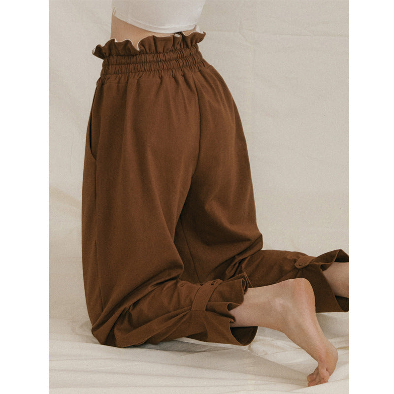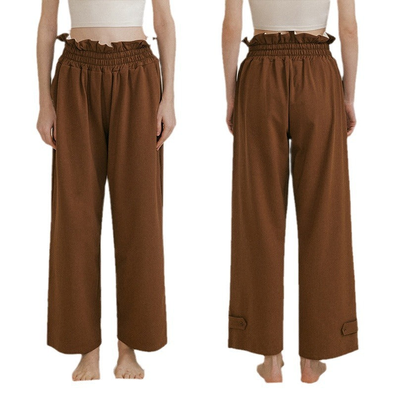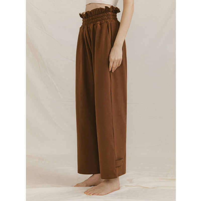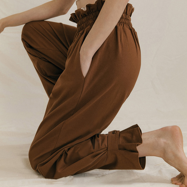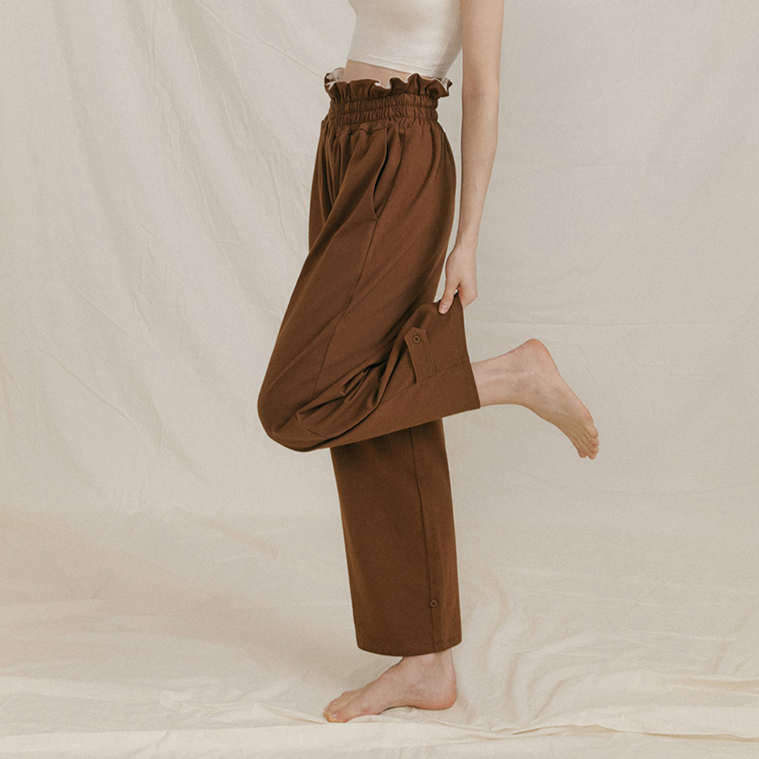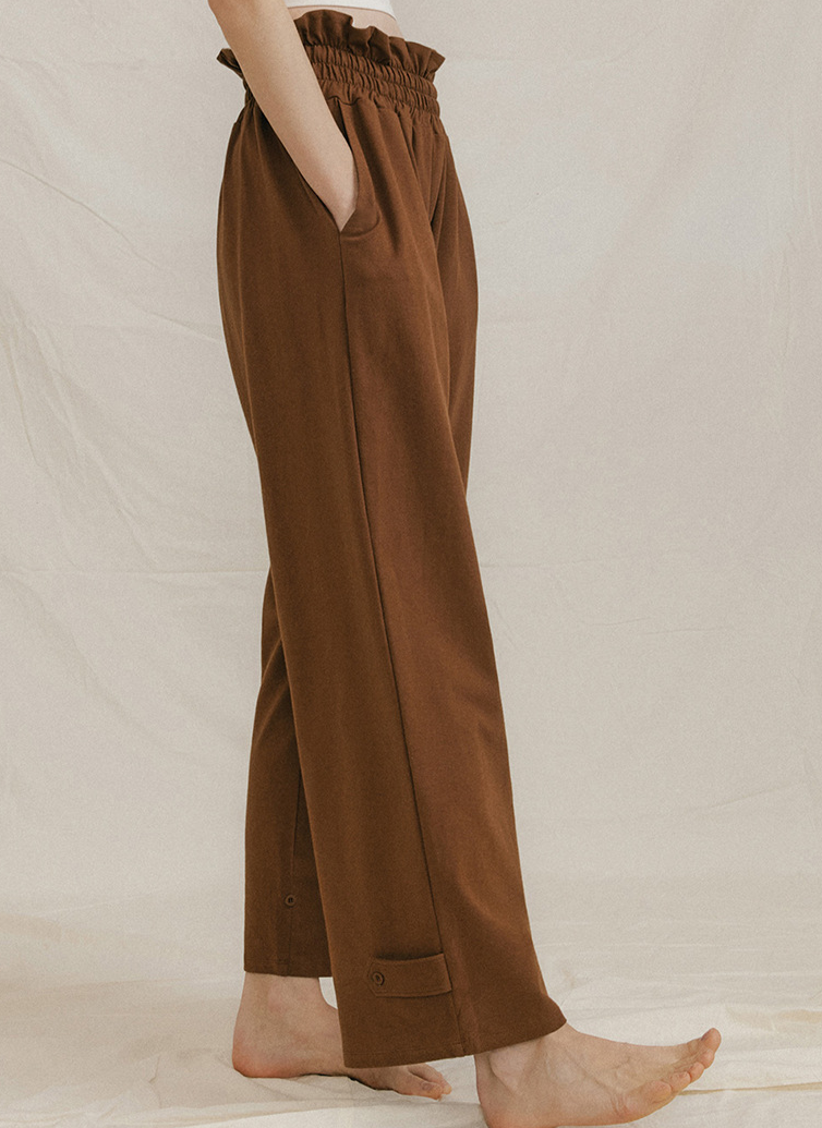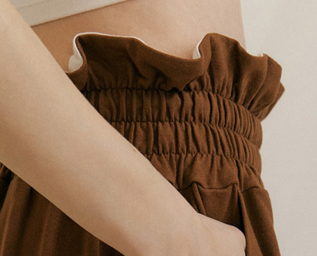 このパンツ、ウエストのフリルデザインがめちゃくちゃ可愛いです!トップスをインして着ると、フリルがアクセントになって一気におしゃれ感が出ますね。ブラウンの色味も上品で、カジュアルすぎずオフィスにも着ていけそう。生地もサラッとしてて、これからの季節に大活躍しそうです!
