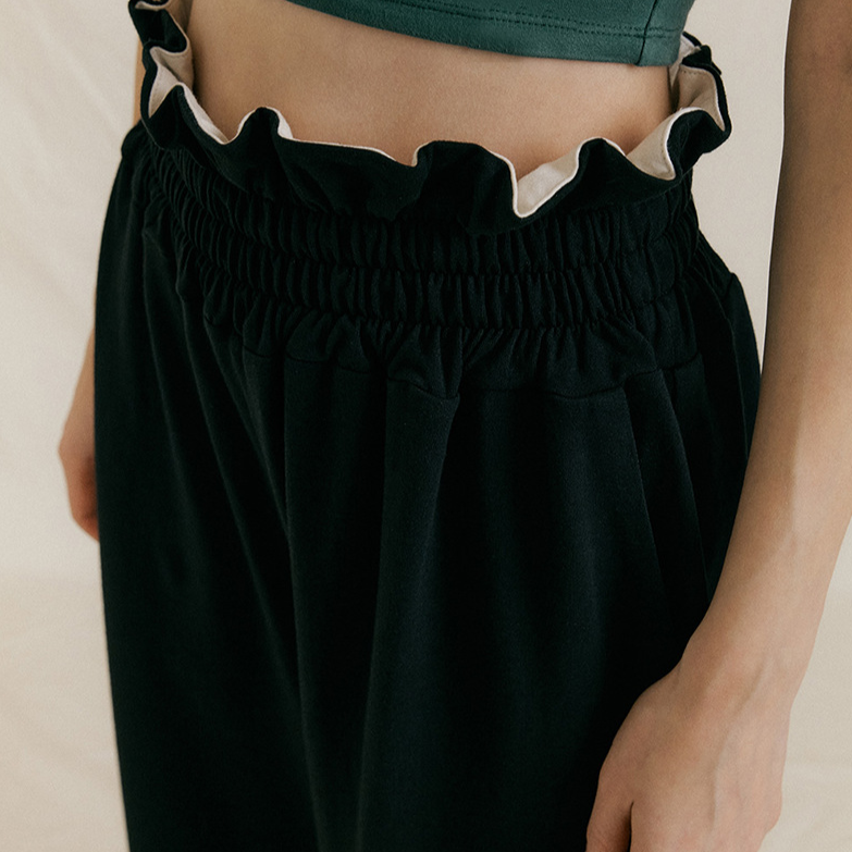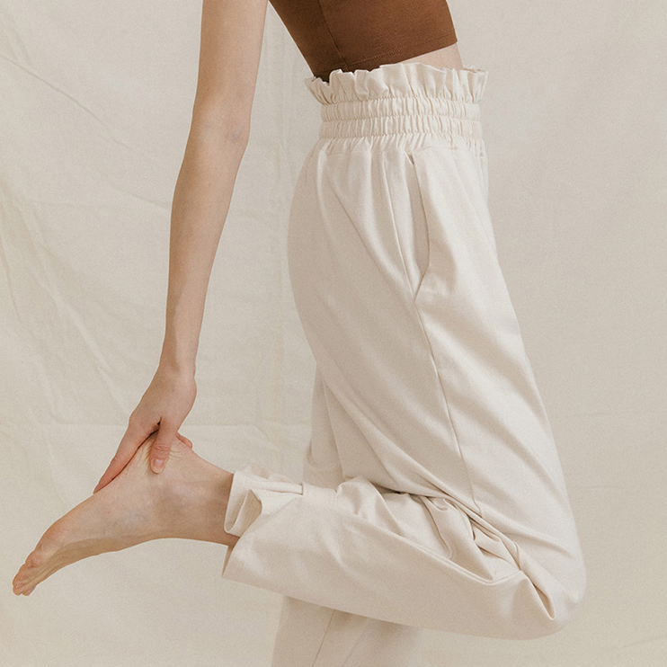 裾がボタンでキュッと絞れるのが本当に便利!気分によって、ちょっと絞って足首見せたり、ゆったりさせてストレートっぽく履いたりと、色々なシルエットが楽しめるのが嬉しいです。自転車に乗る時とかも裾が絡まなくて助かるし、機能性もデザイン性も兼ね備えてて最高!もう一枚色違いで欲しいな〜。