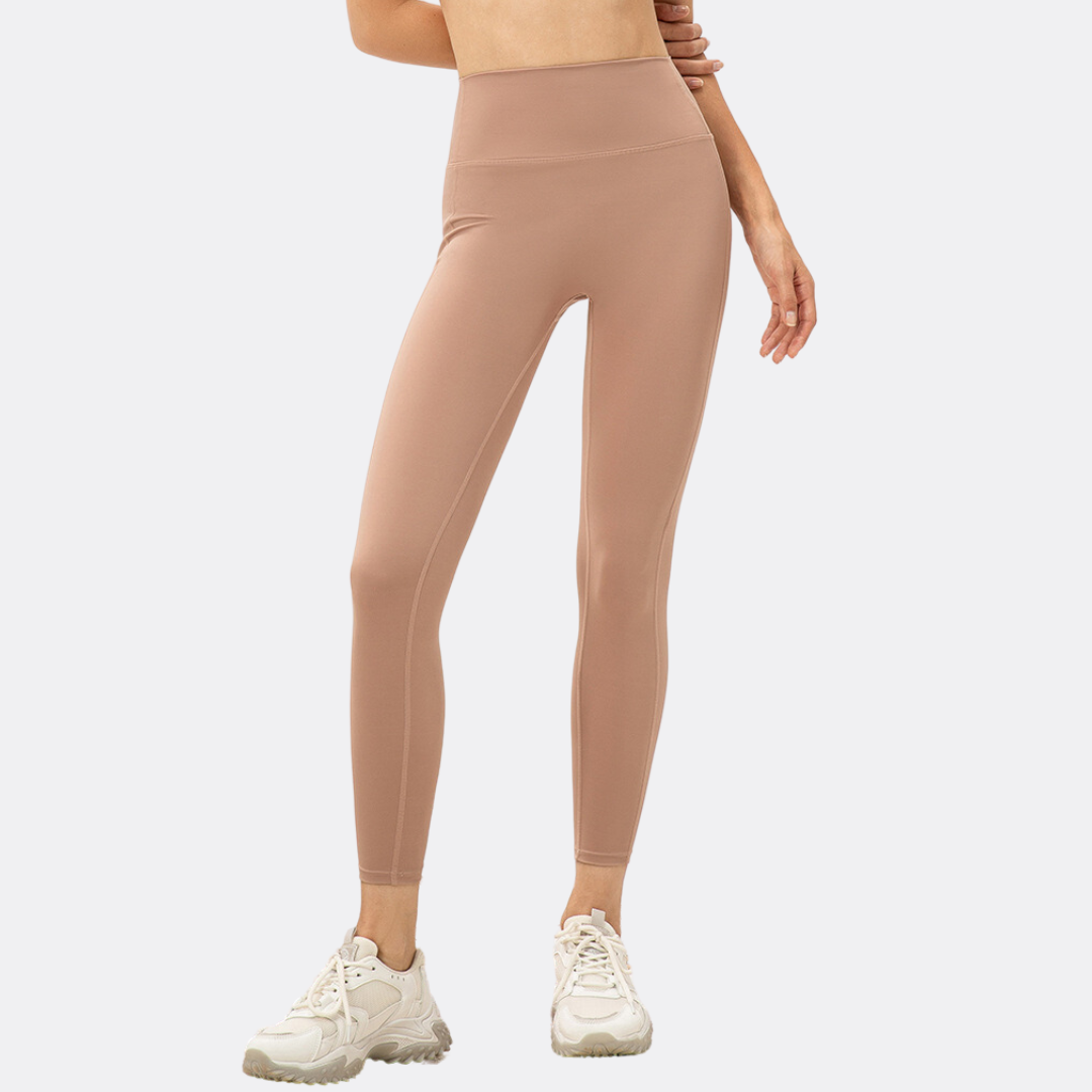 レギンスはハイウエスト仕様で、ショートトップスと合わせてもお腹が見えにくく、側屈や前屈の体勢でもお腹まわりを気にせず安心。